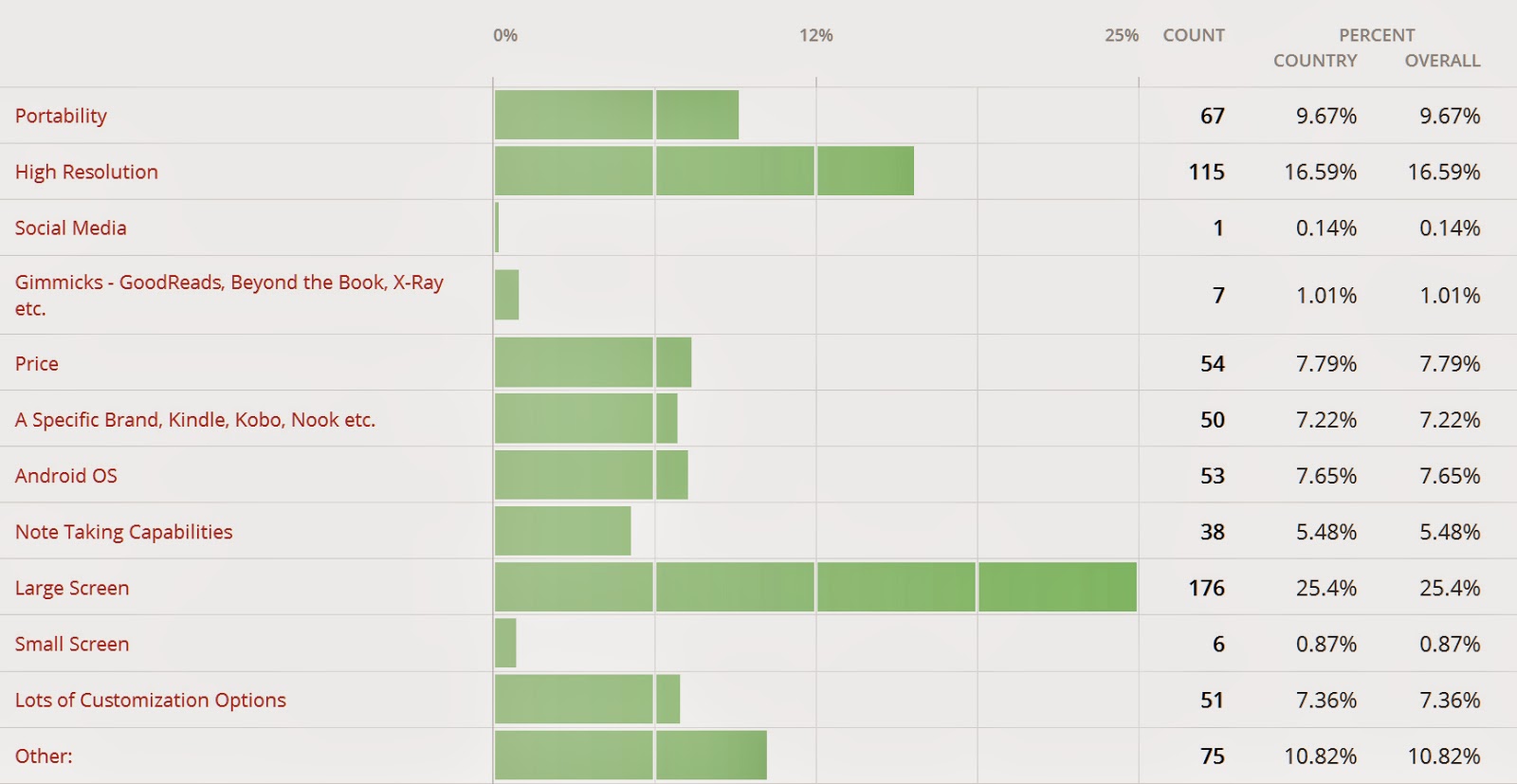 İlk üçe göre bir yorum yaptığımda, bu ankette ve buna benzer karşılaştığım anketlerde de "e-kitap okuyucularla ilgilenenler aynı zamanda teknolojiyi çok iyi kullananlardır" diyebilirim. Fiyatın bu potaya girememesi zaten bu teknoloji fanlarının (innovator early adopters) görüşleri olduğunu ortaya koymaktadır.